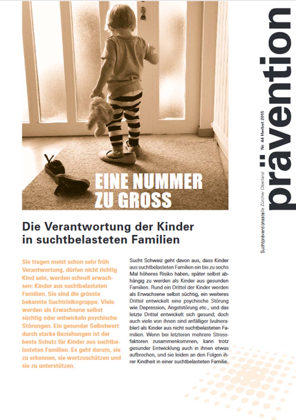Kinder aus suchtbelasteten Familien sind die grösste bekannte Suchtrisikogruppe. In dieser Ausgabe des "Prävention" erklären wir, weshalb das so ist und zeigen auf, wie diese Kinder unterstützt werden können. Zu Wort kommen zwei Fachfrauen aus Prävention und Therapie.